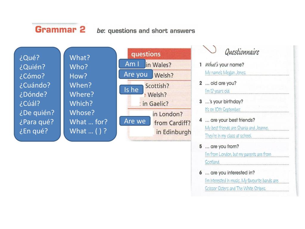 ¿Qué? ¿Quién? ¿Cómo? ¿Cuándo? ¿Dónde? ¿Cúál? ¿De quién? ¿Para qué? ¿En qué? What? Who? How? When? Where? Which? Whose? What … for? What … ( ) ? Am I Are you Is he Are we