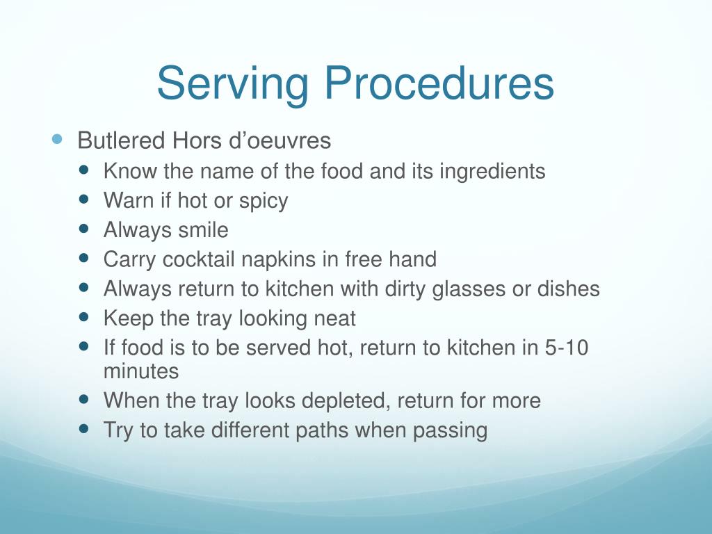 Serving Procedures • Butlered Hors d’oeuvres • Know the name of the food and its ingredients • Warn if hot or spicy • Always smile • Carry cocktail napkins in free hand • Always return to kitchen with dirty glasses or dishes • Keep the tray looking neat • If food is to be served hot, return to kitchen in 5-10 minutes • When the tray looks depleted, return for more • Try to take different paths when passing