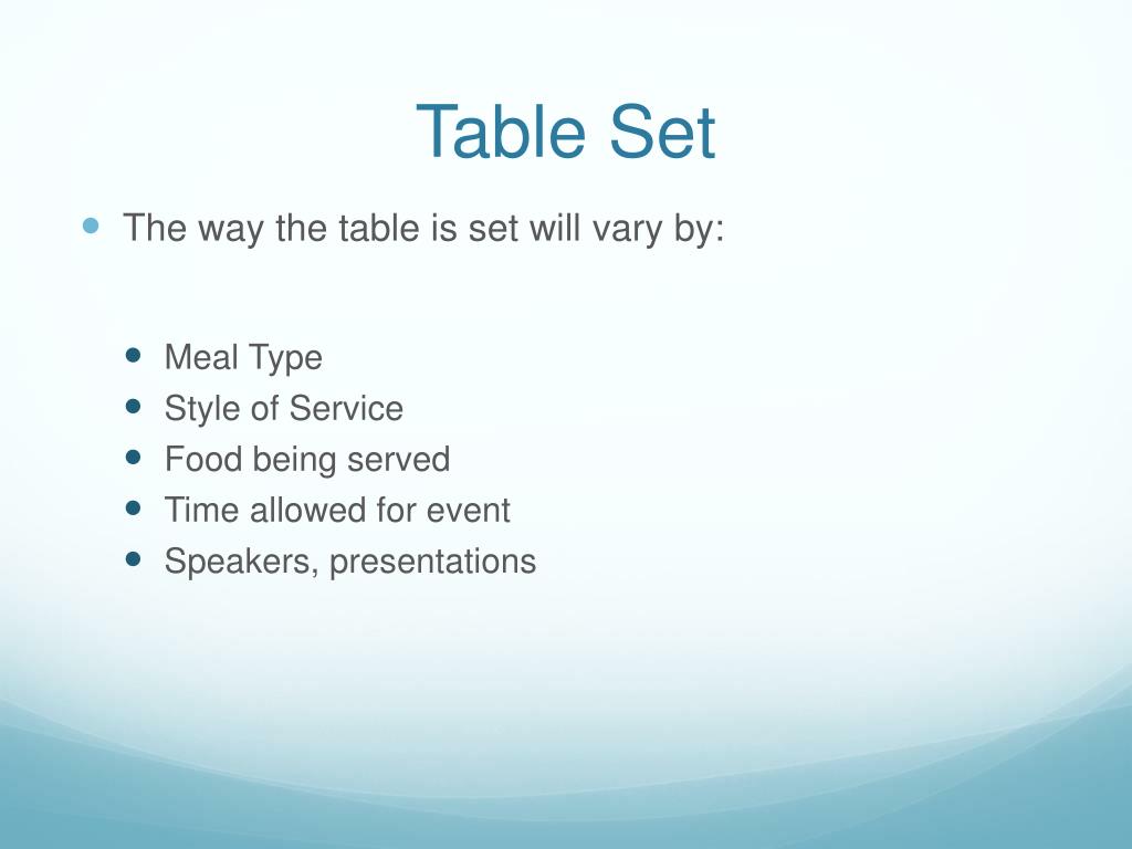 Table Set • The way the table is set will vary by: • Meal Type • Style of Service • Food being served • Time allowed for event • Speakers, presentations