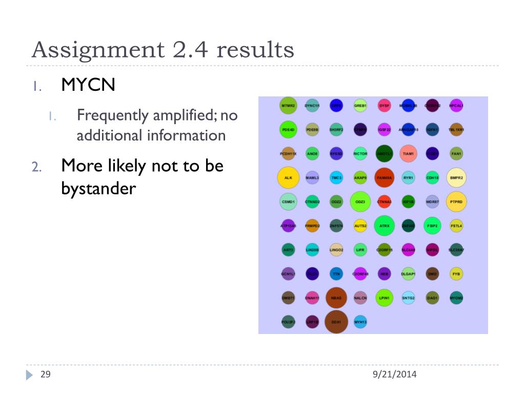 Assignment 2.4 results • MYCN • Frequently amplified; no additional information • More likely not to be bystander