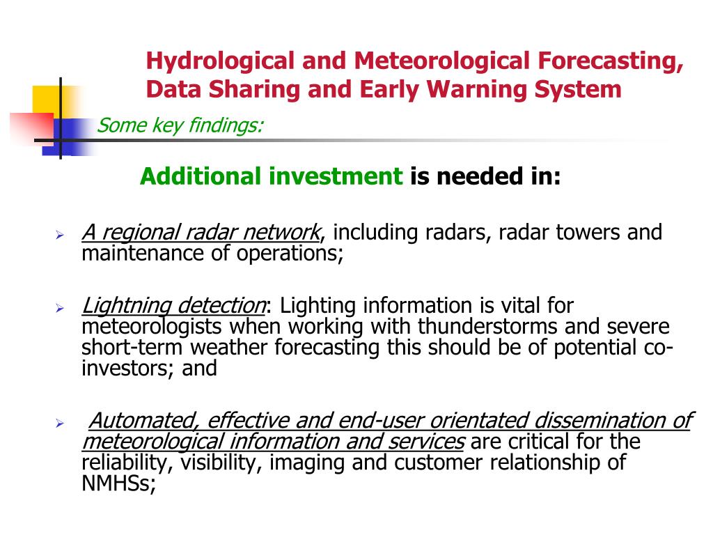 Hydrological and Meteorological Forecasting, Data Sharing and Early Warning System Some key findings: Additional investment is needed in: A regional radar network, including radars, radar towers and maintenance of operations; Lightning detection: Lighting information is vital for meteorologists when working with thunderstorms and severe short-term weather forecasting this should be of potential co-investors; and Automated, effective and end-user orientated dissemination of meteorological information and servicesare critical for the reliability, visibility, imaging and customer relationship of NMHSs;