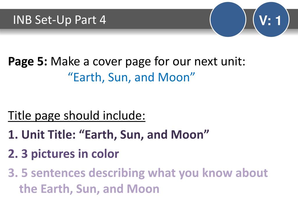 INB Set-Up Part 4 V: 1 Page 5: Make a cover page for our next unit: “Earth, Sun, and Moon” Title page should include: 1. Unit Title: “Earth, Sun, and Moon” 2. 3 pictures in color 3. 5 sentences describing what you know about the Earth, Sun, and Moon