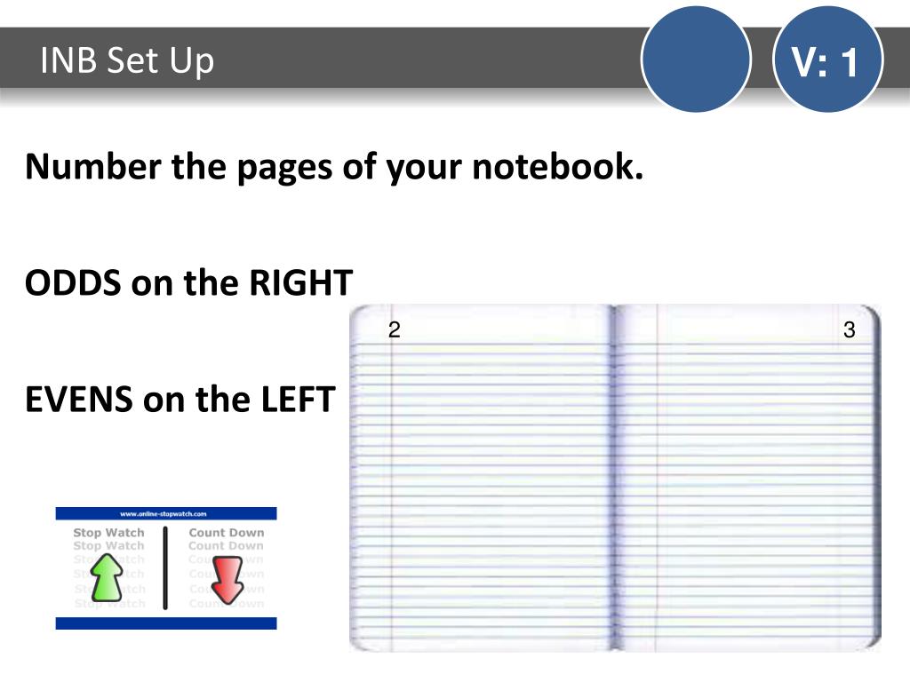 INB Set Up V: 1 Number the pages of your notebook. ODDS on the RIGHT EVENS on the LEFT 2 3
