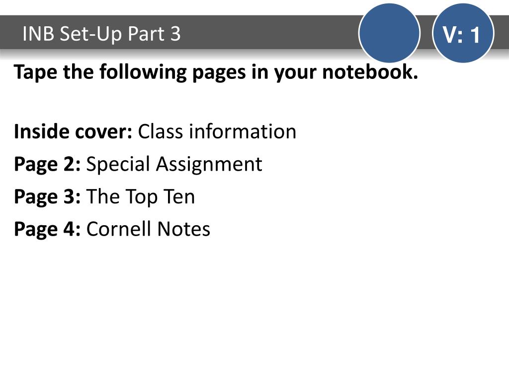 INB Set-Up Part 3 V: 1 Tape the following pages in your notebook. Inside cover: Class information Page 2: Special Assignment Page 3: The Top Ten Page 4: Cornell Notes