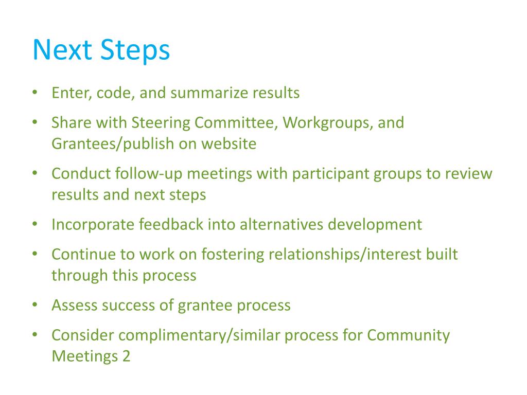 Next Steps • Enter, code, and summarize results • Share with Steering Committee, Workgroups, and Grantees/publish on website • Conduct follow-up meetings with participant groups to review results and next steps • Incorporate feedback into alternatives development • Continue to work on fostering relationships/interest built through this process • Assess success of grantee process • Consider complimentary/similar process for Community Meetings 2