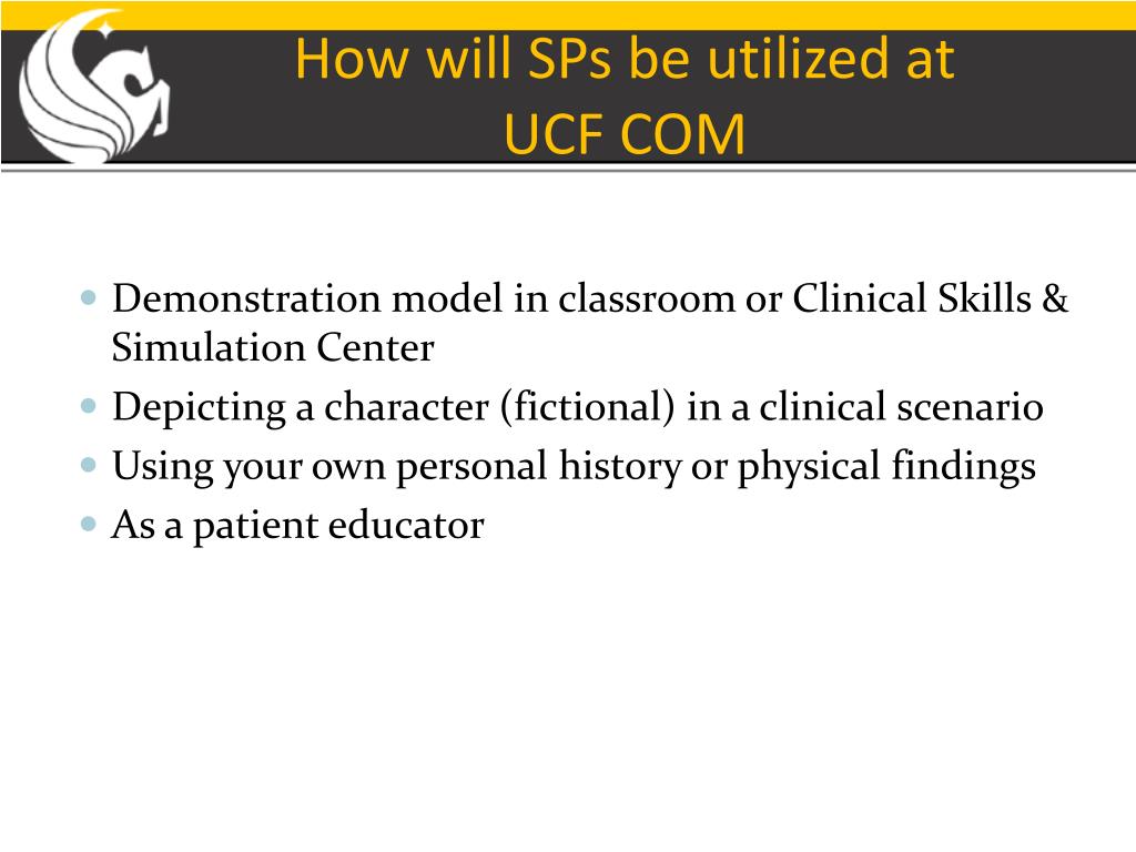 How will SPs be utilized at UCF COM • Demonstration model in classroom or Clinical Skills & Simulation Center • Depicting a character (fictional) in a clinical scenario • Using your own personal history or physical findings • As a patient educator