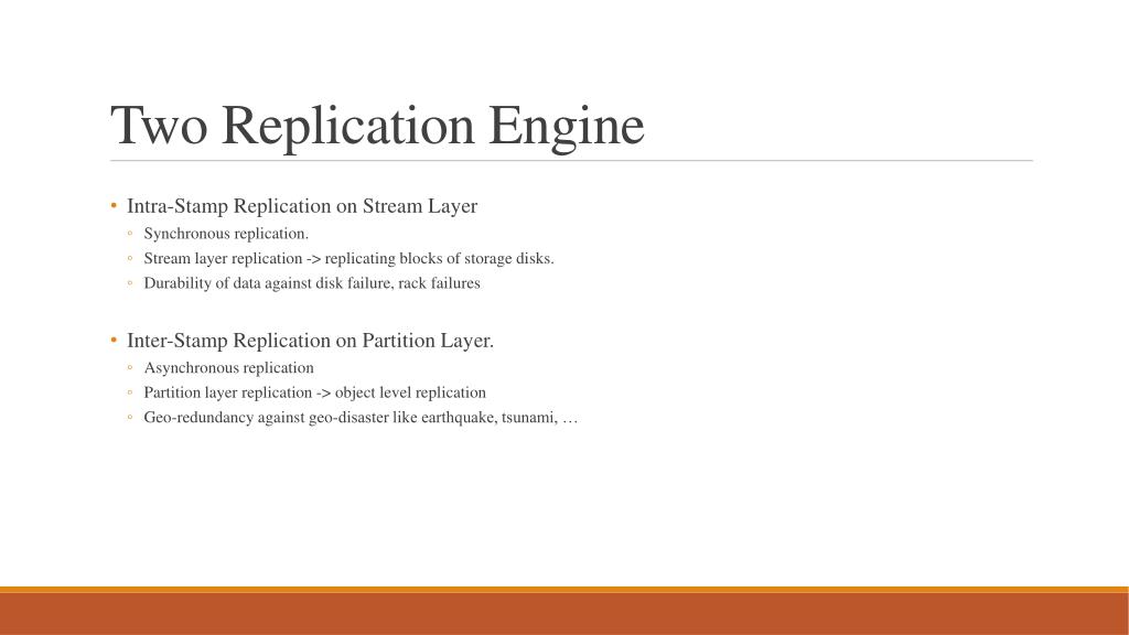 Two Replication Engine • Intra-Stamp Replication on Stream Layer • Synchronous replication. • Stream layer replication -> replicating blocks of storage disks. • Durability of data against disk failure, rack failures • Inter-Stamp Replication on Partition Layer. • Asynchronous replication • Partition layer replication -> object level replication • Geo-redundancy against geo-disaster like earthquake, tsunami, …
