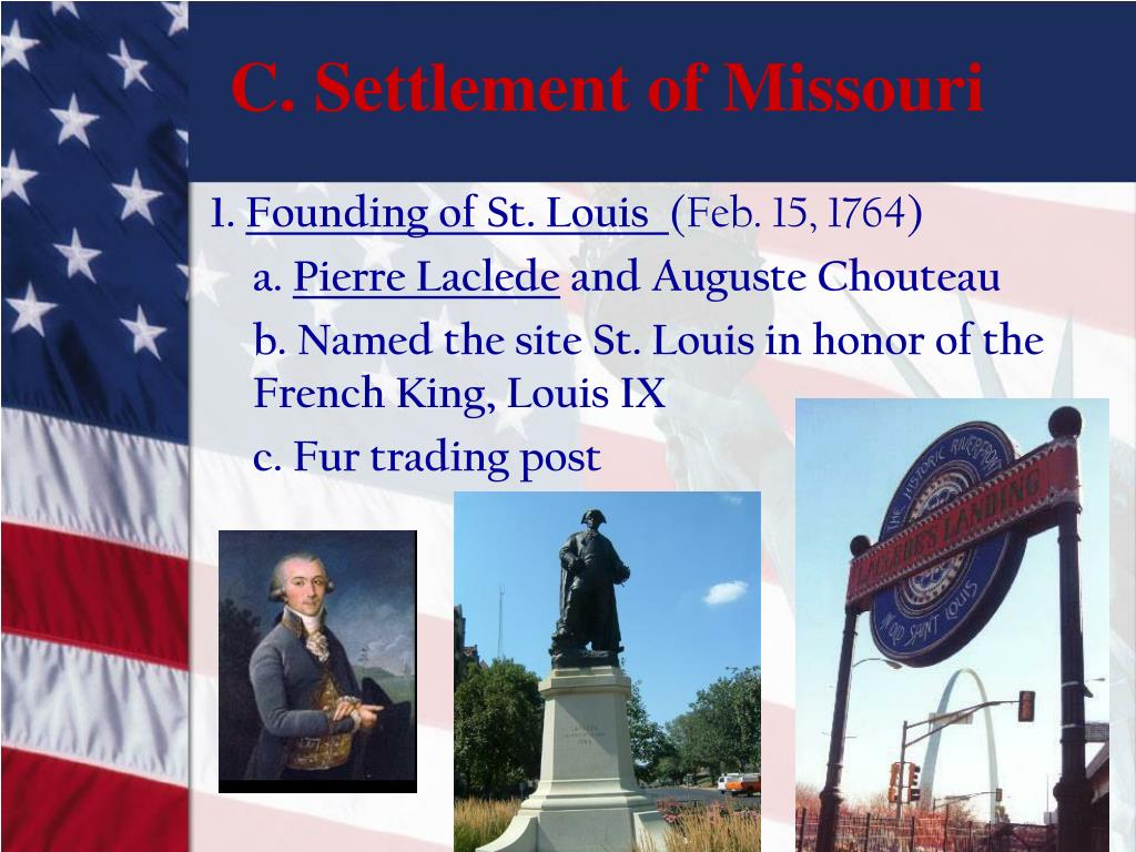 C. Settlement of Missouri 1. Founding of St. Louis (Feb. 15, 1764) a. Pierre Laclede and Auguste Chouteau b. Named the site St. Louis in honor of the French King, Louis IX c. Fur trading post