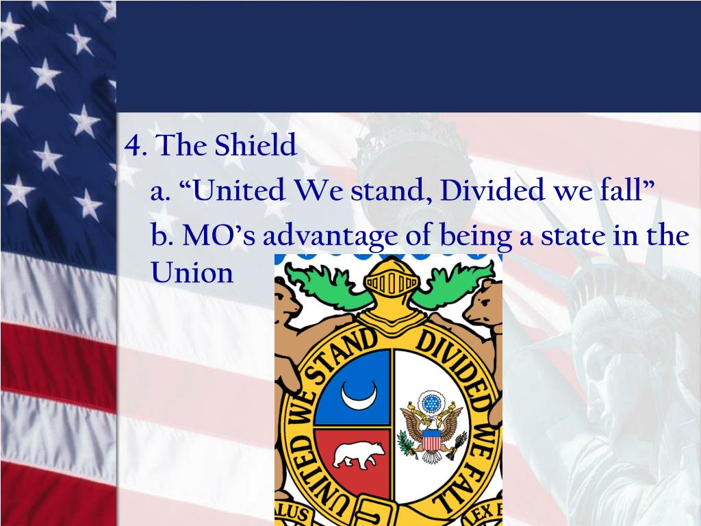 4. The Shield a. “United We stand, Divided we fall” b. MO’s advantage of being a state in the Union
