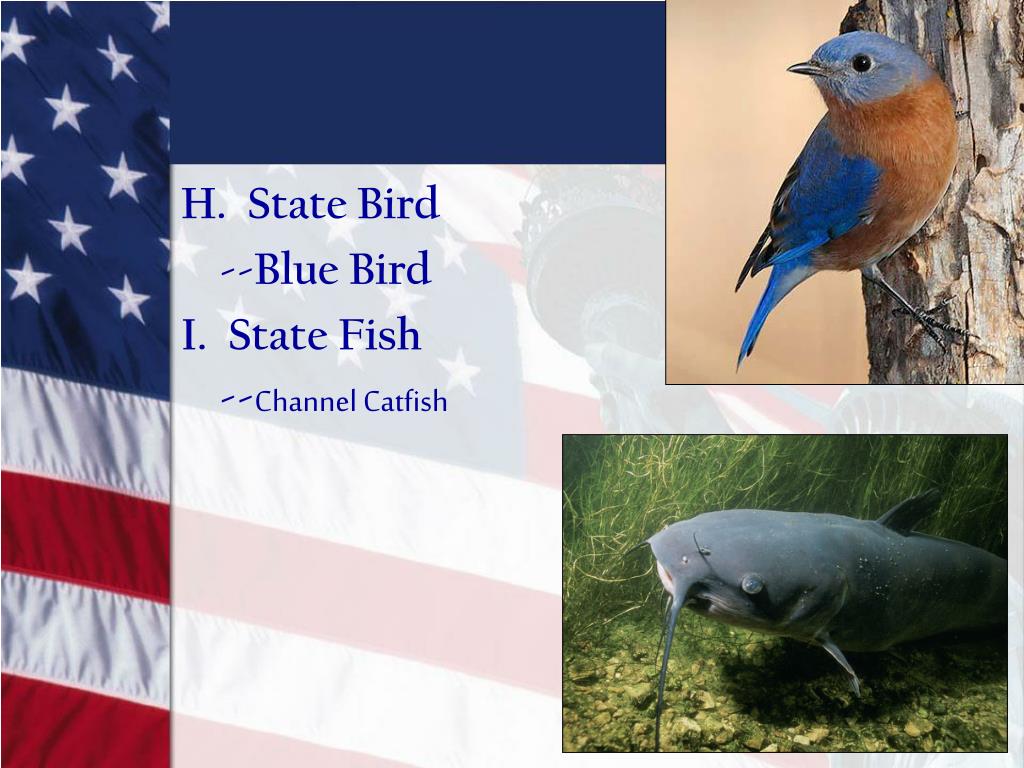 H. State Bird --Blue Bird I. State Fish --Channel Catfish