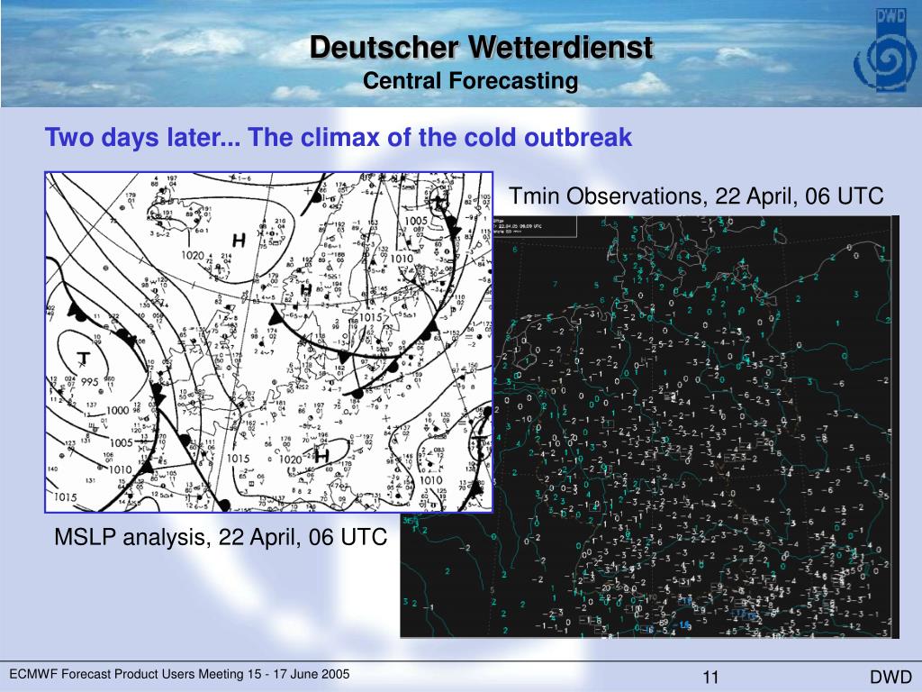 Two days later... The climax of the cold outbreak Tmin Observations, 22 April, 06 UTC MSLP analysis, 22 April, 06 UTC ECMWF Forecast Product Users Meeting 15 - 17 June 2005