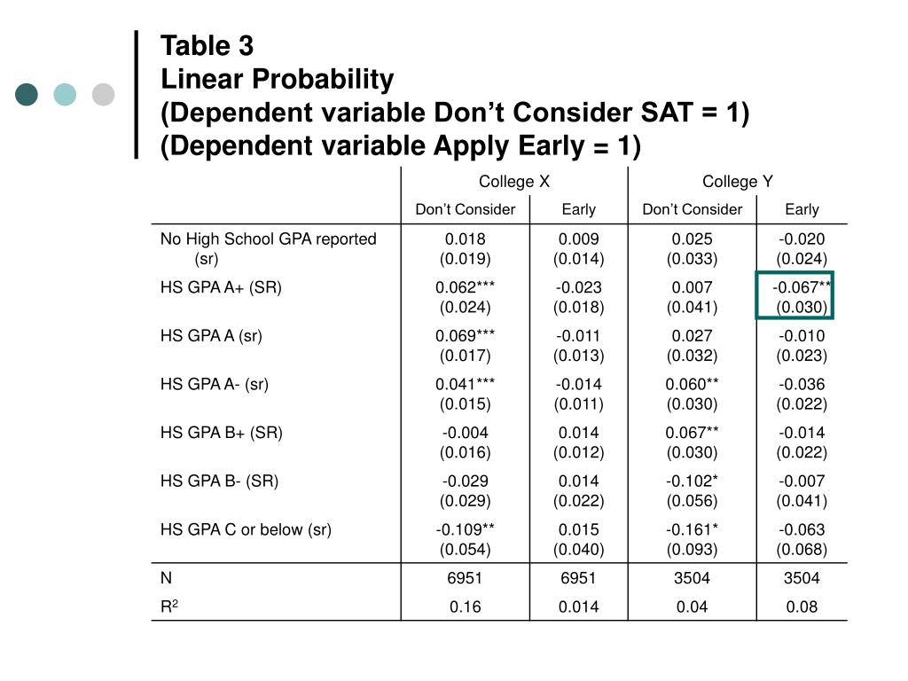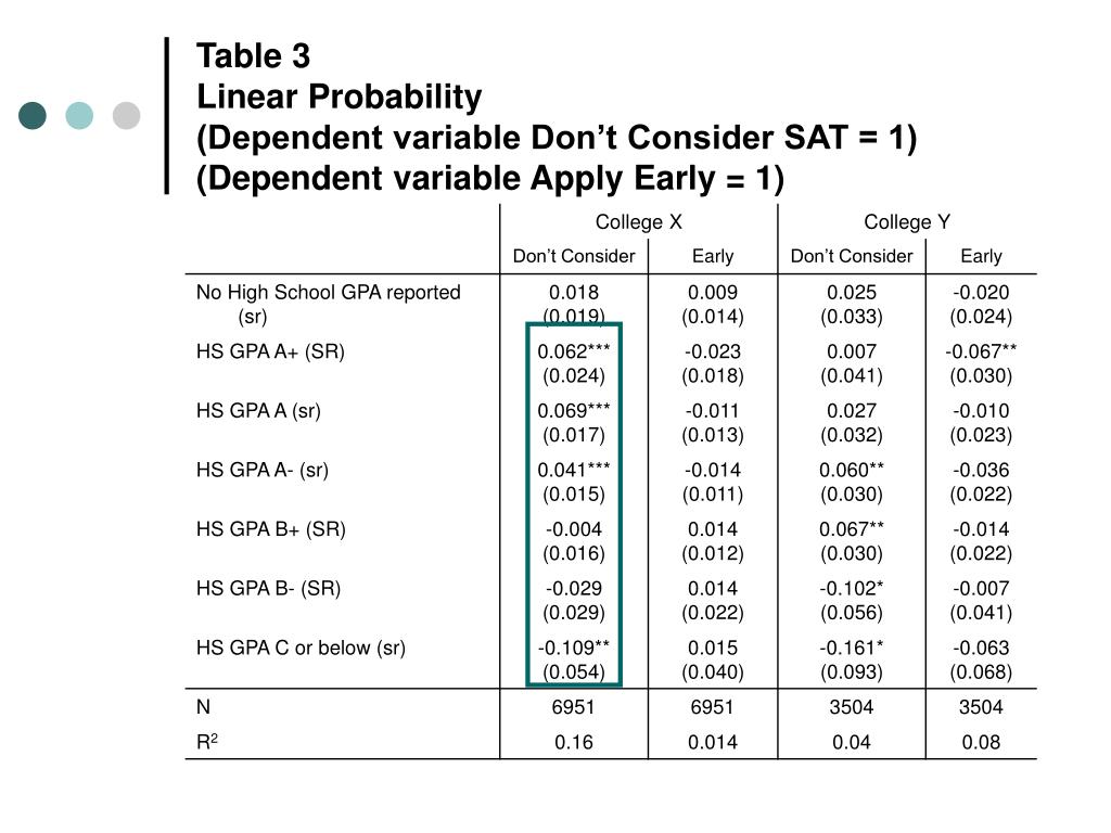 Table 3Linear Probability (Dependent variable Don’t Consider SAT = 1)(Dependent variable Apply Early = 1)
