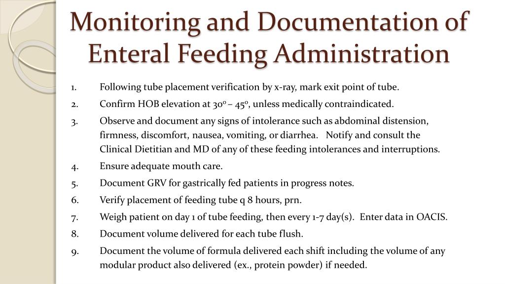 Monitoring and Documentation of Enteral Feeding Administration Following tube placement verification by x-ray, mark exit point of tube. Confirm HOB elevation at 30o – 45o, unless medically contraindicated. Observe and document any signs of intolerance such as abdominal distension, firmness, discomfort, nausea, vomiting, or diarrhea. Notify and consult the Clinical Dietitian and MD of any of these feeding intolerances and interruptions. Ensure adequate mouth care. Document GRV for gastrically fed patients in progress notes. Verify placement of feeding tube q 8 hours, prn. Weigh patient on day 1 of tube feeding, then every 1-7 day(s). Enter data in OACIS. Document volume delivered for each tube flush. Document the volume of formula delivered each shift including the volume of any modular product also delivered (ex., protein powder) if needed.