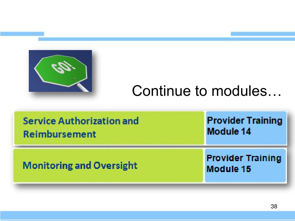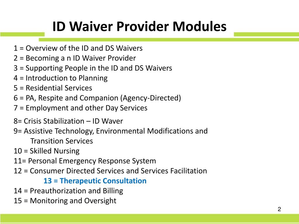 ID Waiver Provider Modules 1 = Overview of the ID and DS Waivers 2 = Becoming a n ID Waiver Provider 3 = Supporting People in the ID and DS Waivers 4 = Introduction to Planning 5 = Residential Services 6 = PA, Respite and Companion (Agency-Directed) 7 = Employment and other Day Services 8= Crisis Stabilization – ID Waver 9= Assistive Technology, Environmental Modifications and Transition Services 10 = Skilled Nursing 11= Personal Emergency Response System 12 = Consumer Directed Services and Services Facilitation 13 = Therapeutic Consultation 14 = Preauthorization and Billing 15 = Monitoring and Oversight