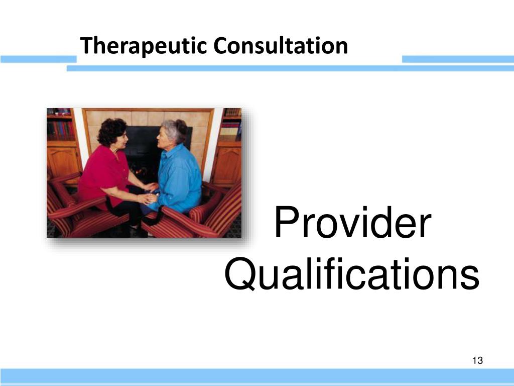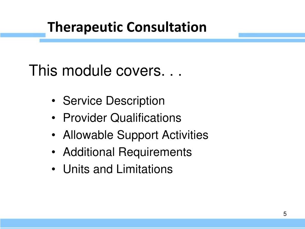 This module covers. . . Therapeutic Consultation • Service Description • Provider Qualifications • Allowable Support Activities • Additional Requirements • Units and Limitations