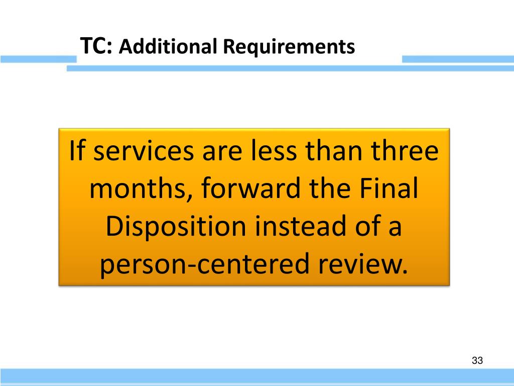 TC: Additional Requirements If services are less than three months, forward the Final Disposition instead of a person-centered review.
