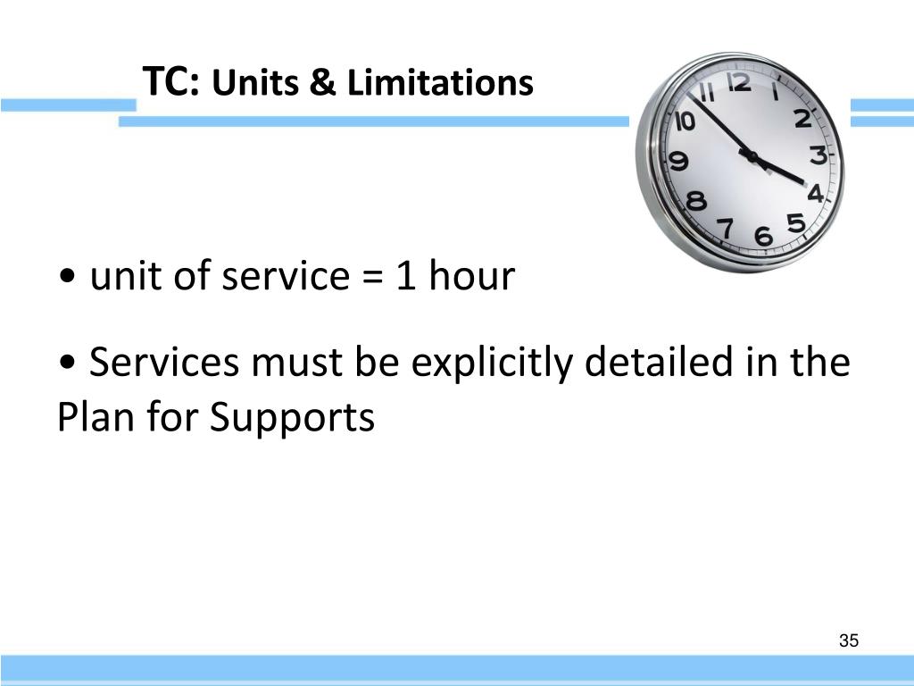 TC: Units & Limitations • unit of service = 1 hour • Services must be explicitly detailed in the Plan for Supports