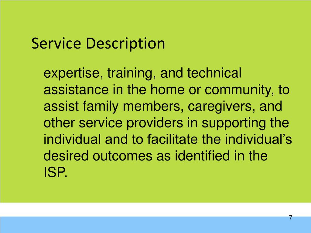 Service Description expertise, training, and technical assistance in the home or community, to assist family members, caregivers, and other service providers in supporting the individual and to facilitate the individual’s desired outcomes as identified in the ISP.