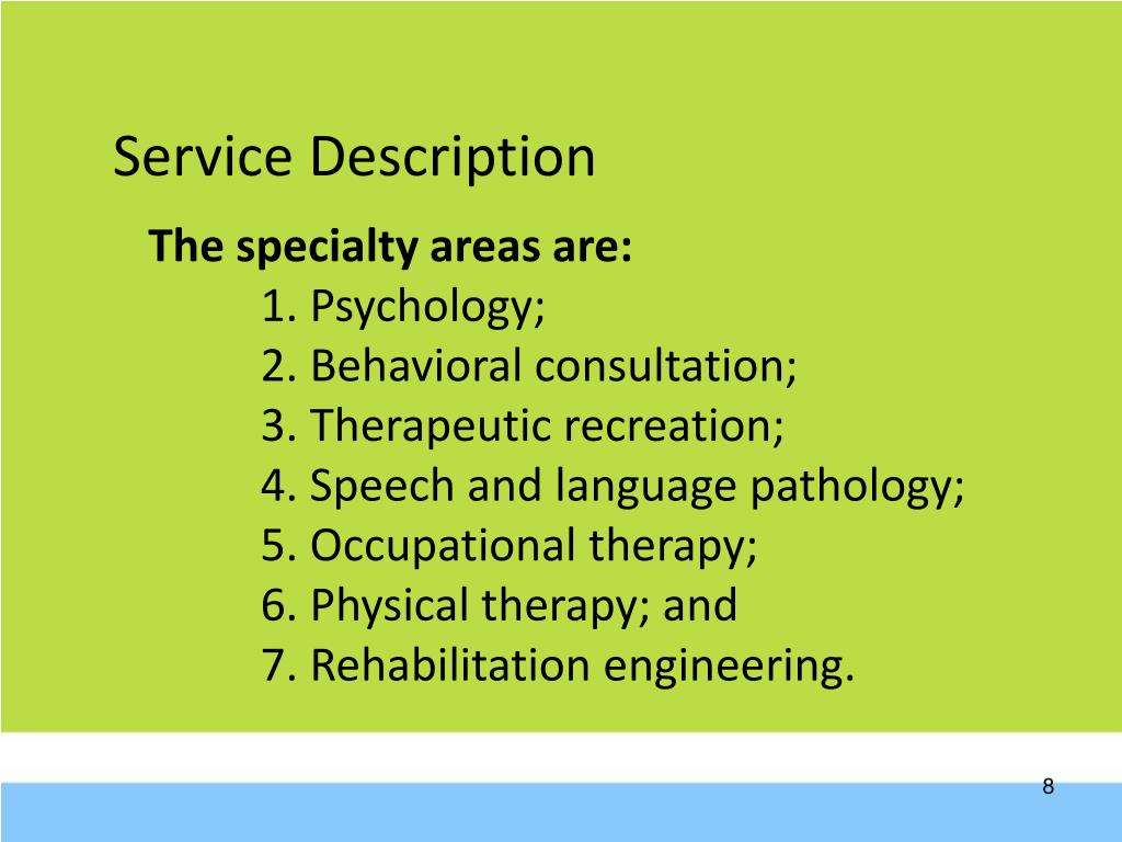 Service Description The specialty areas are: 1. Psychology; 2. Behavioral consultation; 3. Therapeutic recreation; 4. Speech and language pathology; 5. Occupational therapy; 6. Physical therapy; and 7. Rehabilitation engineering.