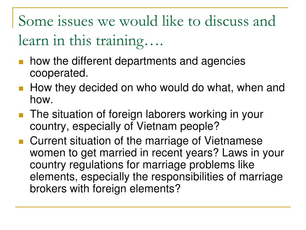 Some issues we would like to discuss and learn in this training…. • how the different departments and agencies cooperated. • How they decided on who would do what, when and how. • The situation of foreign laborers working in your country, especially of Vietnam people? • Current situation of the marriage of Vietnamese women to get married in recent years? Laws in your country regulations for marriage problems like elements, especially the responsibilities of marriage brokers with foreign elements?