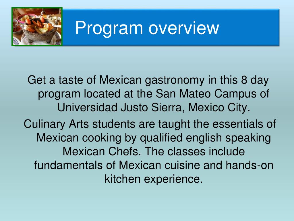 Programoverview Get a taste of Mexican gastronomy in this 8 day program located at the San Mateo Campus of Universidad Justo Sierra, Mexico City. Culinary Arts students are taught the essentials of Mexican cooking by qualified english speaking Mexican Chefs. The classes include fundamentals of Mexican cuisine and hands-on kitchen experience.