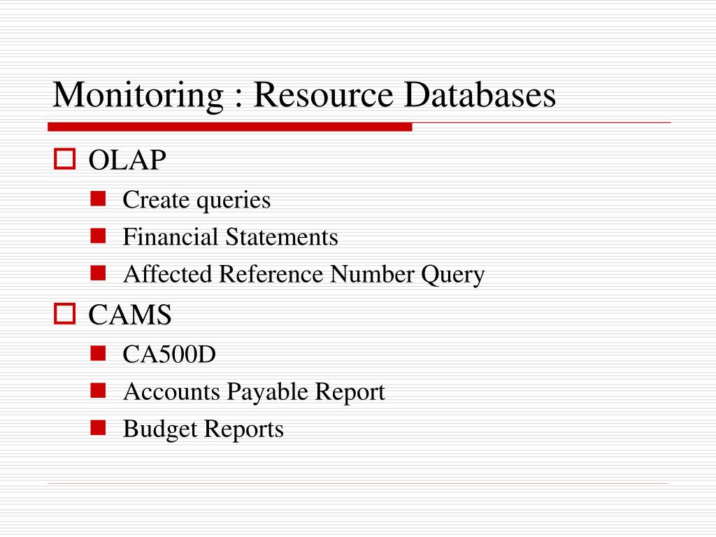 Monitoring : Resource Databases • OLAP • Create queries • Financial Statements • Affected Reference Number Query • CAMS • CA500D • Accounts Payable Report • Budget Reports