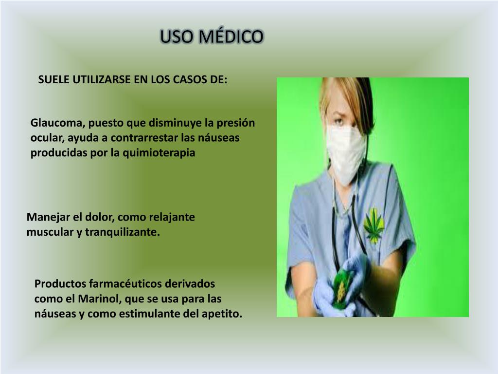 USO MÉDICO SUELE UTILIZARSE EN LOS CASOS DE: Glaucoma, puesto que disminuye la presión ocular, ayuda a contrarrestar las náuseas producidas por la quimioterapia Manejar el dolor, como relajante muscular y tranquilizante. Productos farmacéuticos derivados como el Marinol, que se usa para las náuseas y como estimulante del apetito.