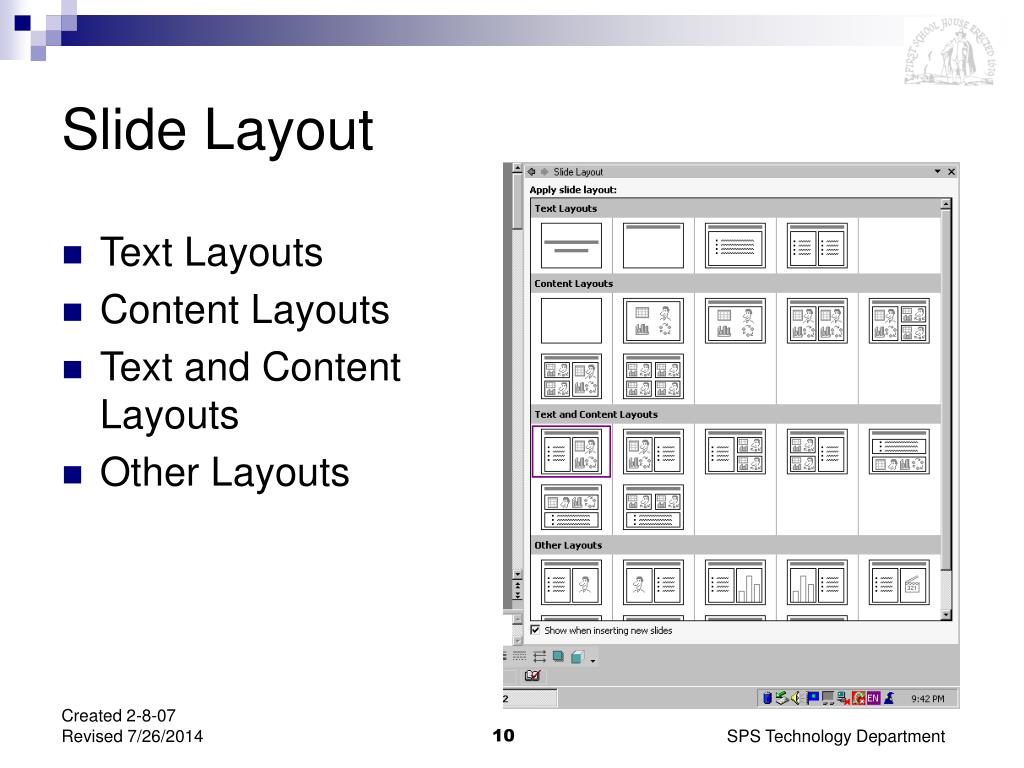 Slide Layout • Text Layouts • Content Layouts • Text and Content Layouts • Other Layouts SPS Technology Department
