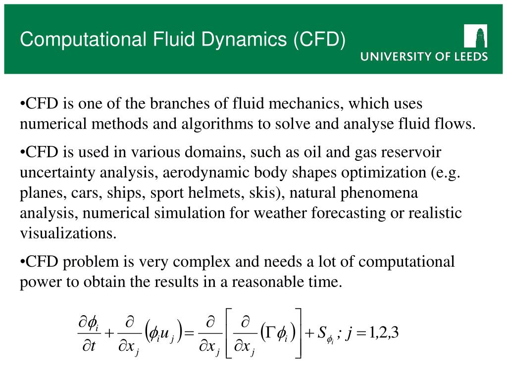 Computational Fluid Dynamics (CFD) • CFD is one of the branches of fluid mechanics, which uses numerical methods and algorithms to solve and analyse fluid flows. • CFD is used in various domains, such as oil and gas reservoir uncertainty analysis, aerodynamic body shapes optimization (e.g. planes, cars, ships, sport helmets, skis), natural phenomena analysis, numerical simulation for weather forecasting or realistic visualizations. • CFD problem is very complex and needs a lot of computational power to obtain the results in a reasonable time.