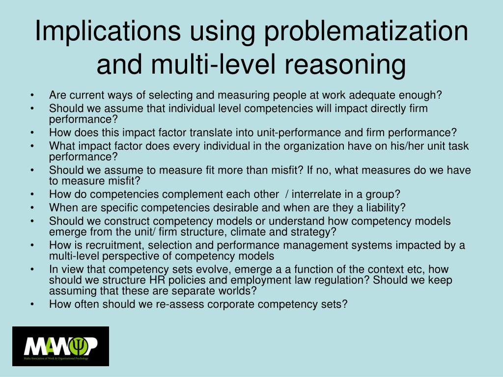 Argument line • What is competency?? • What is the principle of problematization?? • What is multi-level theory? • What have problematization and multi-level theory applications to do with competency? • What are the applied implications??
