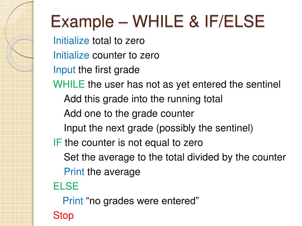 Example - WHILE Set total to zero Set grade counter to one WHILE grade counter is less than or equal to ten Input the next grade Add the grade into the total Set the class average to the total divided by ten Print the class average Stop
