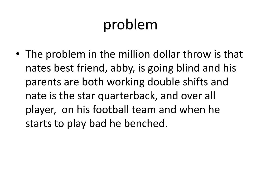 problem • The problem in the million dollar throw is that nates best friend, abby, is going blind and his parents are both working double shifts and nate is the star quarterback, and over all player, on his football team and when he starts to play bad he benched.