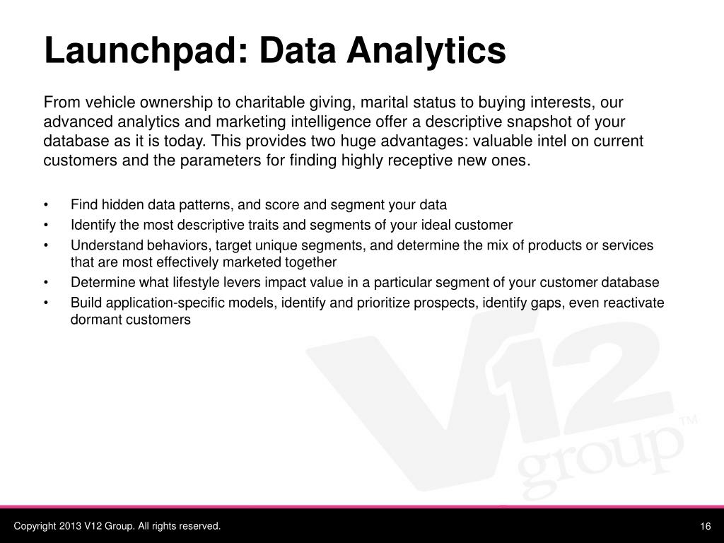 Launchpad: Data Analytics From vehicle ownership to charitable giving, marital status to buying interests, our advanced analytics and marketing intelligence offer a descriptive snapshot of your database as it is today. This provides two huge advantages: valuable intel on current customers and the parameters for finding highly receptive new ones. • Find hidden data patterns, and score and segment your data • Identify the most descriptive traits and segments of your ideal customer • Understand behaviors, target unique segments, and determine the mix of products or services that are most effectively marketed together • Determine what lifestyle levers impact value in a particular segment of your customer database • Build application-specific models, identify and prioritize prospects, identify gaps, even reactivate dormant customers
