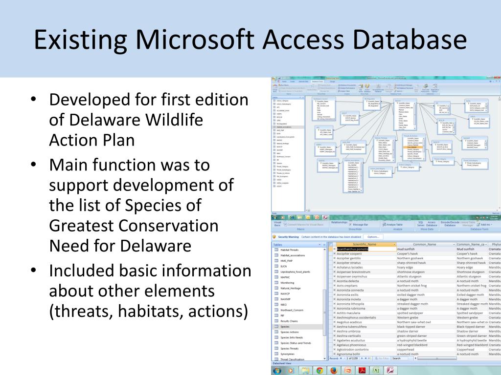 Existing Microsoft Access Database • Developed for first edition of Delaware Wildlife Action Plan • Main function was to support development of the list of Species of Greatest Conservation Need for Delaware • Included basic information about other elements (threats, habitats, actions)