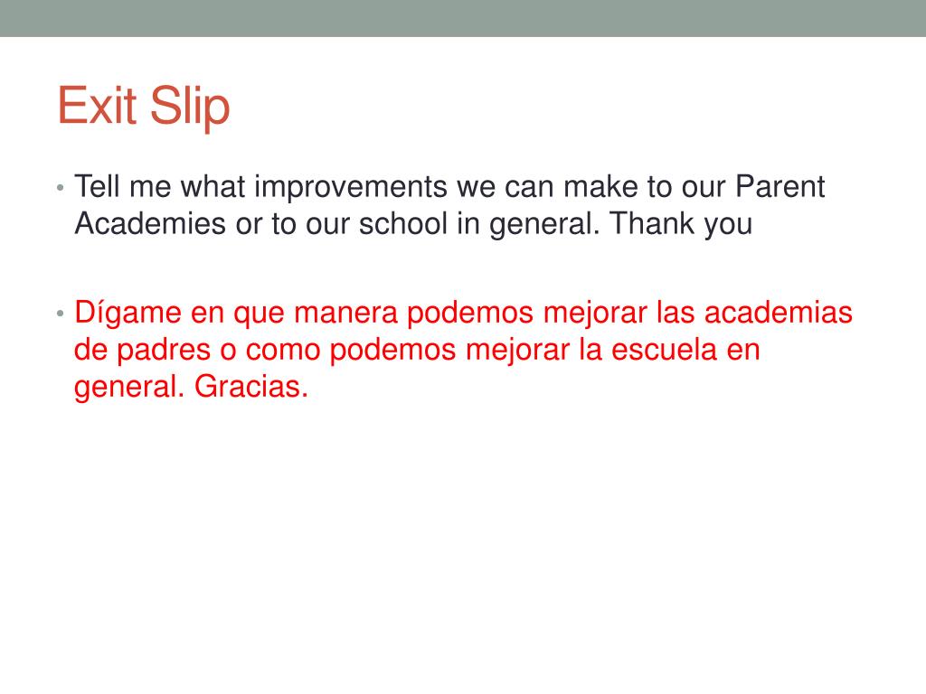 Exit Slip • Tell me what improvements we can make to our Parent Academies or to our school in general. Thank you • Dígame en que manera podemos mejorar las academias de padres o como podemos mejorar la escuela en general. Gracias.