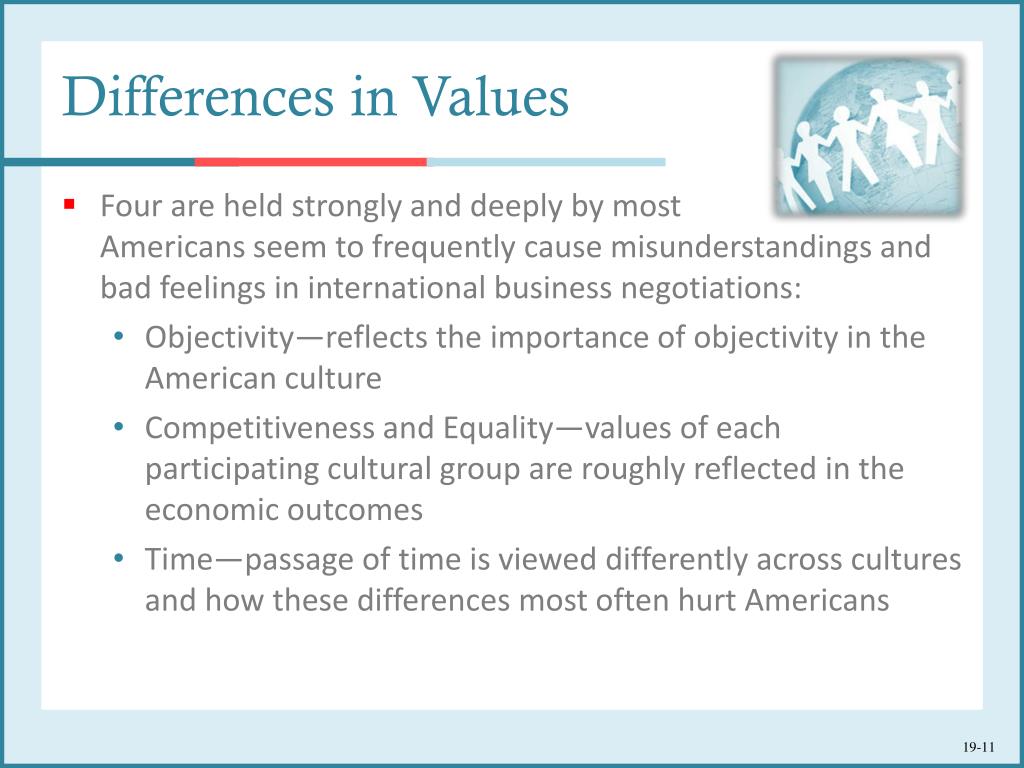 Differences in Values • Four are held strongly and deeply by most Americans seem to frequently cause misunderstandings and bad feelings in international business negotiations: • Objectivity—reflects the importance of objectivity in the American culture • Competitiveness and Equality—values of each participating cultural group are roughly reflected in the economic outcomes • Time—passage of time is viewed differently across cultures and how these differences most often hurt Americans