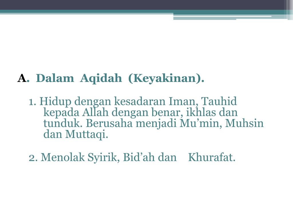 12. A.  DalamAqidah (Keyakinan). 1. HidupdengankesadaranIman, Tauhidkepada Allah denganbenar, ikhlasdantunduk. BerusahamenjadiMu’min, MuhsindanMuttaqi. 2. MenolakSyirik, Bid’ahdanKhurafat.
