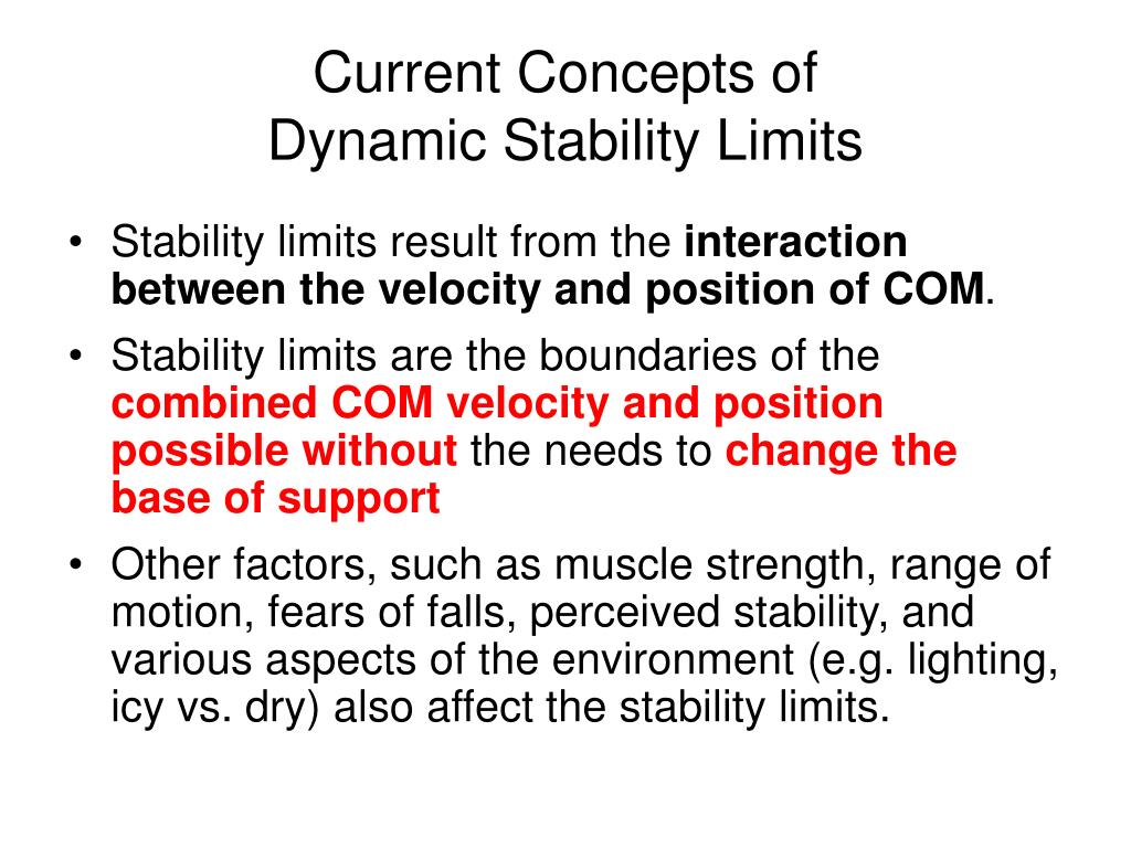 Current Concepts of Dynamic Stability Limits • Stability limits result from the interaction between the velocity and position of COM. • Stability limits are the boundaries of the combined COM velocity and position possible withoutthe needs to change the base of support • Other factors, such as muscle strength, range of motion, fears of falls, perceived stability, and various aspects of the environment (e.g. lighting, icy vs. dry) also affect the stability limits.