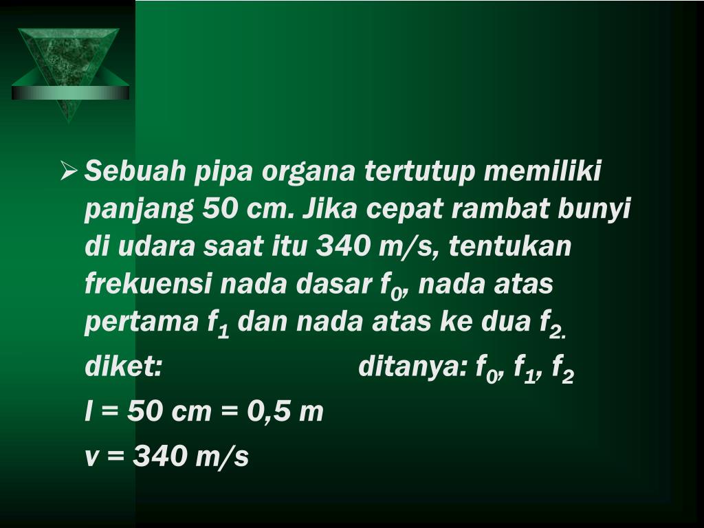 Sebuah pipa organa tertutup memiliki panjang 50 cm. Jika cepat rambat bunyi di udara saat itu 340 m/s, tentukan frekuensi nada dasar f0, nada atas pertama f1 dan nada atas ke dua f2. diket: ditanya: f0, f1, f2 l = 50 cm = 0,5 m v = 340 m/s