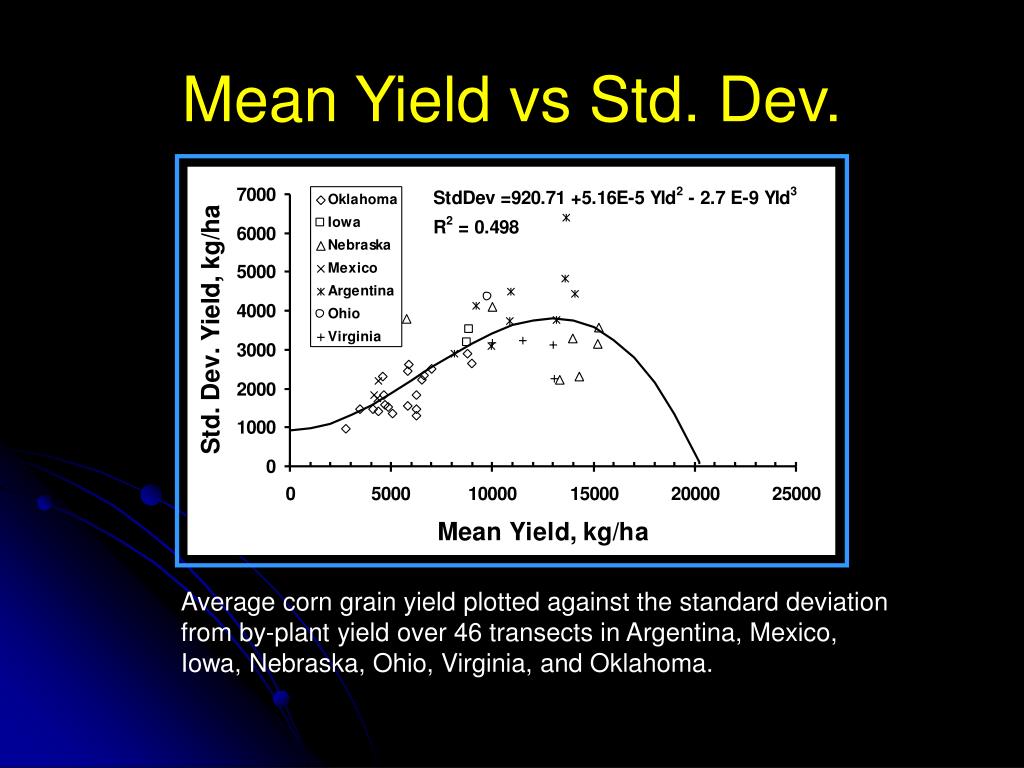 Mean Yield vs Std. Dev. Average corn grain yield plotted against the standard deviation from by-plant yield over 46 transects in Argentina, Mexico, Iowa, Nebraska, Ohio, Virginia, and Oklahoma.