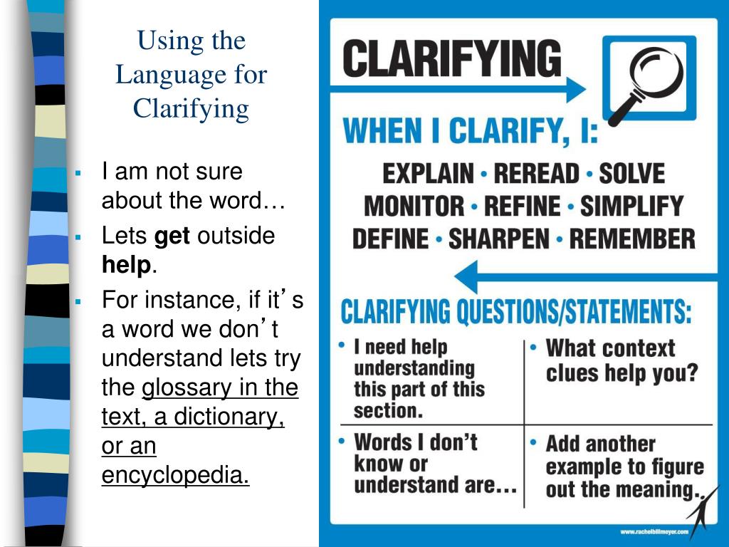 Using the Language for Clarifying • I am not sure about the word… • Lets get outside help. • For instance, if it’s a word we don’t understand lets try the glossary in the text, a dictionary, or an encyclopedia.