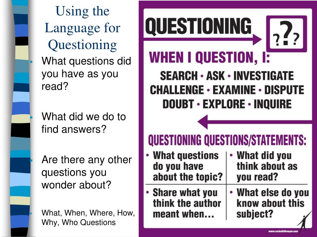 Using the Language for Questioning • What questions did you have as you read? • What did we do to find answers? • Are there any other questions you wonder about? • What, When, Where, How, Why, Who Questions