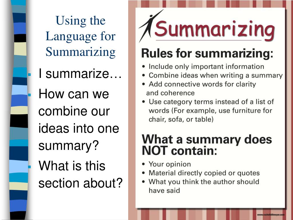 Using the Language for Summarizing • I summarize… • How can we combine our ideas into one summary? • What is this section about?