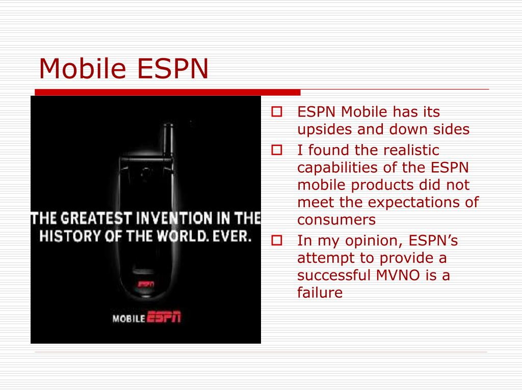 Mobile ESPN • ESPN Mobile has its upsides and down sides • I found the realistic capabilities of the ESPN mobile products did not meet the expectations of consumers • In my opinion, ESPN’s attempt to provide a successful MVNO is a failure