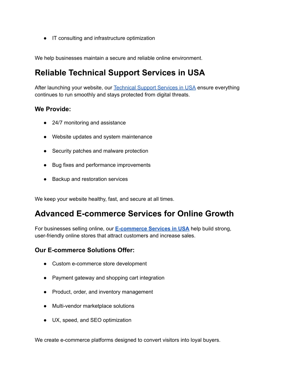 3. ● IT consulting and infrastructure optimization We help businesses maintain a secure and reliable online environment. Reliable Technical Support Services in USA After launching your website, our Technical Support Services in USA ensure everything continues to run smoothly and stays protected from digital threats. We Provide: ● 24/7 monitoring and assistance ● Website updates and system maintenance ● Security patches and malware protection ● Bug fixes and performance improvements ● Backup and restoration services We keep your website healthy, fast, and secure at all times. Advanced E-commerce Services for Online Growth For businesses selling online, our E-commerce Services in USA help build strong, user-friendly online stores that attract customers and increase sales. Our E-commerce Solutions Offer: ● Custom e-commerce store development ● Payment gateway and shopping cart integration ● Product, order, and inventory management ● Multi-vendor marketplace solutions ● UX, speed, and SEO optimization We create e-commerce platforms designed to convert visitors into loyal buyers.