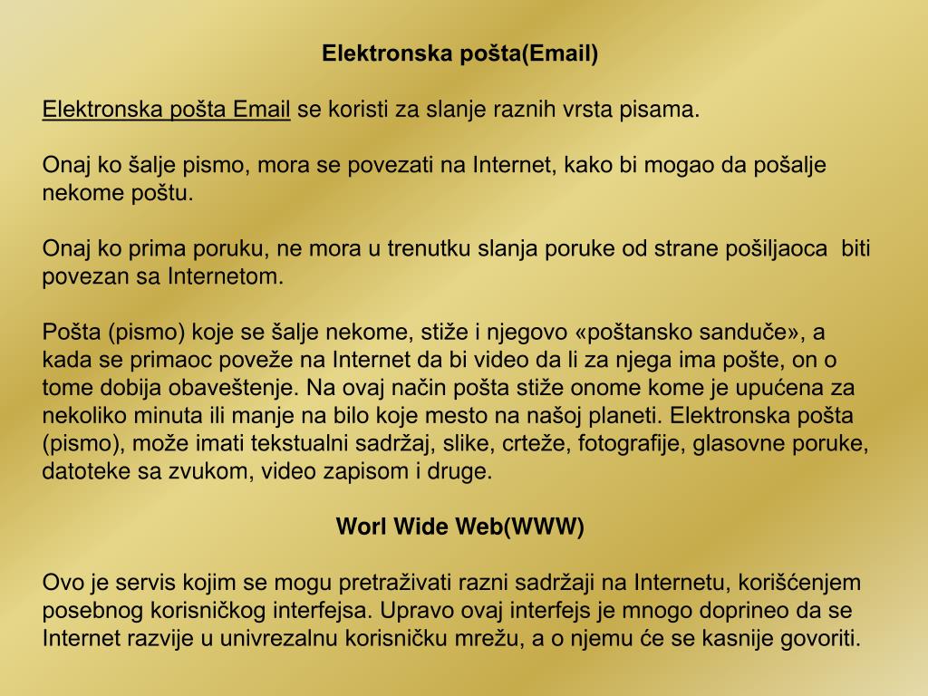 Elektronska pošta(Email) Elektronska pošta Email se koristi za slanje raznih vrsta pisama. Onaj ko šalje pismo, mora se povezati na Internet, kako bi mogao da pošalje nekome poštu. Onaj ko prima poruku, ne mora u trenutku slanja poruke od strane pošiljaoca biti povezan sa Internetom. Pošta (pismo) koje se šalje nekome, stiže i njegovo «poštansko sanduče», a kada se primaoc poveže na Internet da bi video da li za njega ima pošte, on o tome dobija obaveštenje. Na ovaj način pošta stiže onome kome je upućena za nekoliko minuta ili manje na bilo koje mesto na našoj planeti. Elektronska pošta (pismo), može imati tekstualni sadržaj, slike, crteže, fotografije, glasovne poruke, datoteke sa zvukom, video zapisom i druge. Worl Wide Web(WWW) Ovo je servis kojim se mogu pretraživati razni sadržaji na Internetu, korišćenjem posebnog korisničkog interfejsa. Upravo ovaj interfejs je mnogo doprineo da se Internet razvije u univrezalnu korisničku mrežu, a o njemu će se kasnije govoriti.