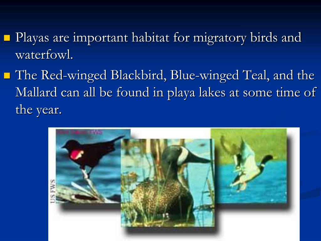 Playas are important habitat for migratory birds and waterfowl. • The Red-winged Blackbird, Blue-winged Teal, and the Mallard can all be found in playa lakes at some time of the year.