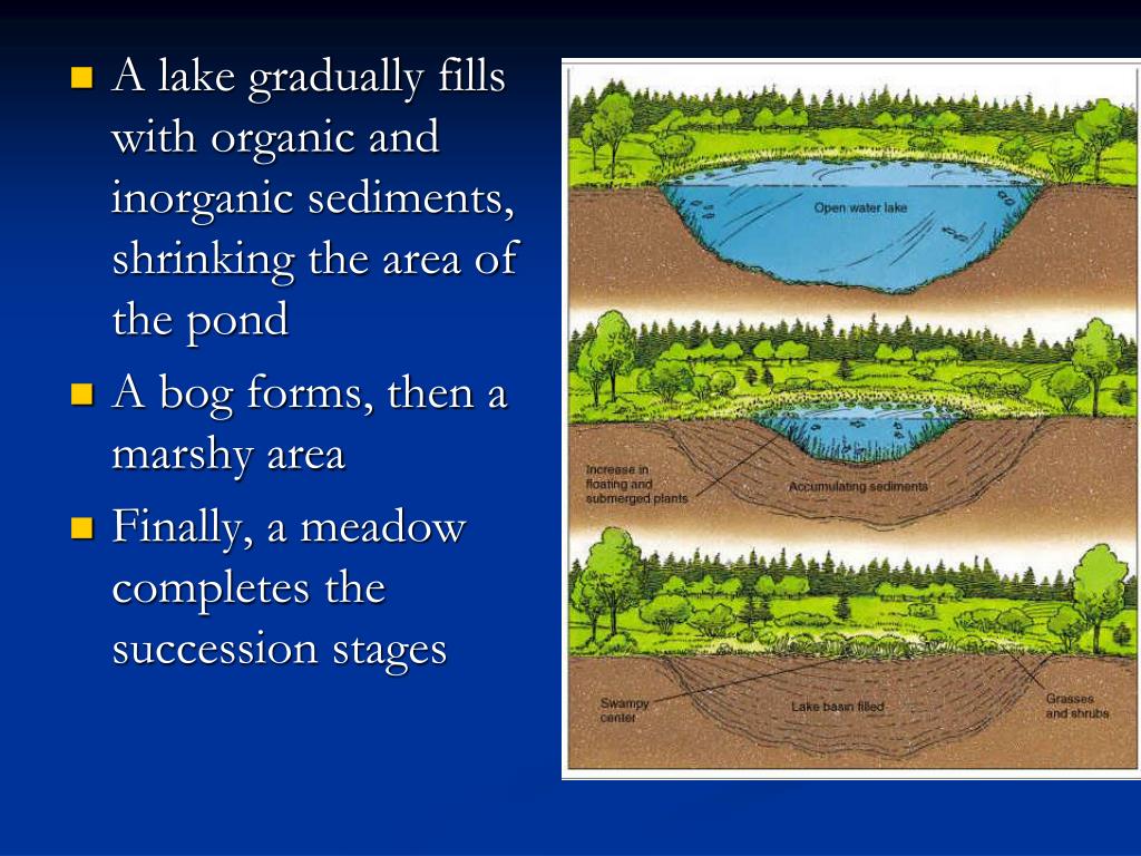 A lake gradually fills with organic and inorganic sediments, shrinking the area of the pond • A bog forms, then a marshy area • Finally, a meadow completes the succession stages