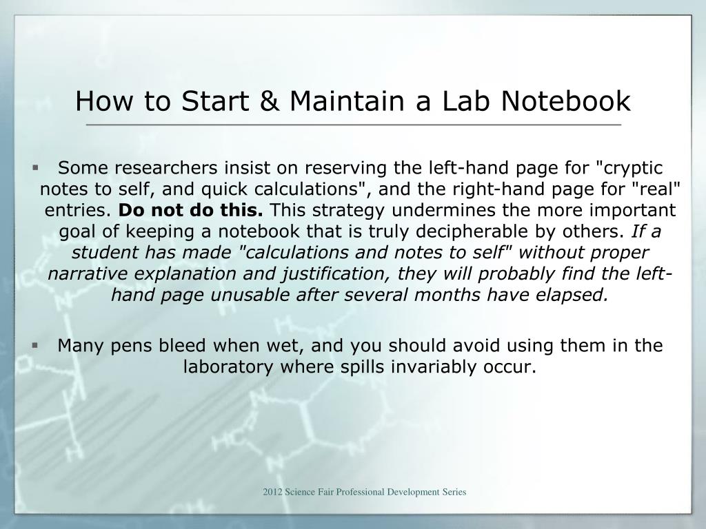 How to Start & Maintain a Lab Notebook • Some researchers insist on reserving the left-hand page for "cryptic notes to self, and quick calculations", and the right-hand page for "real" entries. Do not do this. This strategy undermines the more important goal of keeping a notebook that is truly decipherable by others. If a student has made "calculations and notes to self" without proper narrative explanation and justification, they will probably find the left-hand page unusable after several months have elapsed. • Many pens bleed when wet, and you should avoid using them in the laboratory where spills invariably occur. 2012 Science Fair Professional Development Series