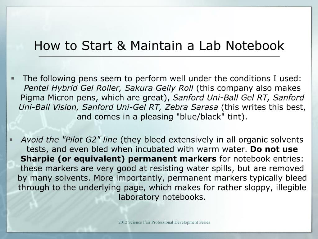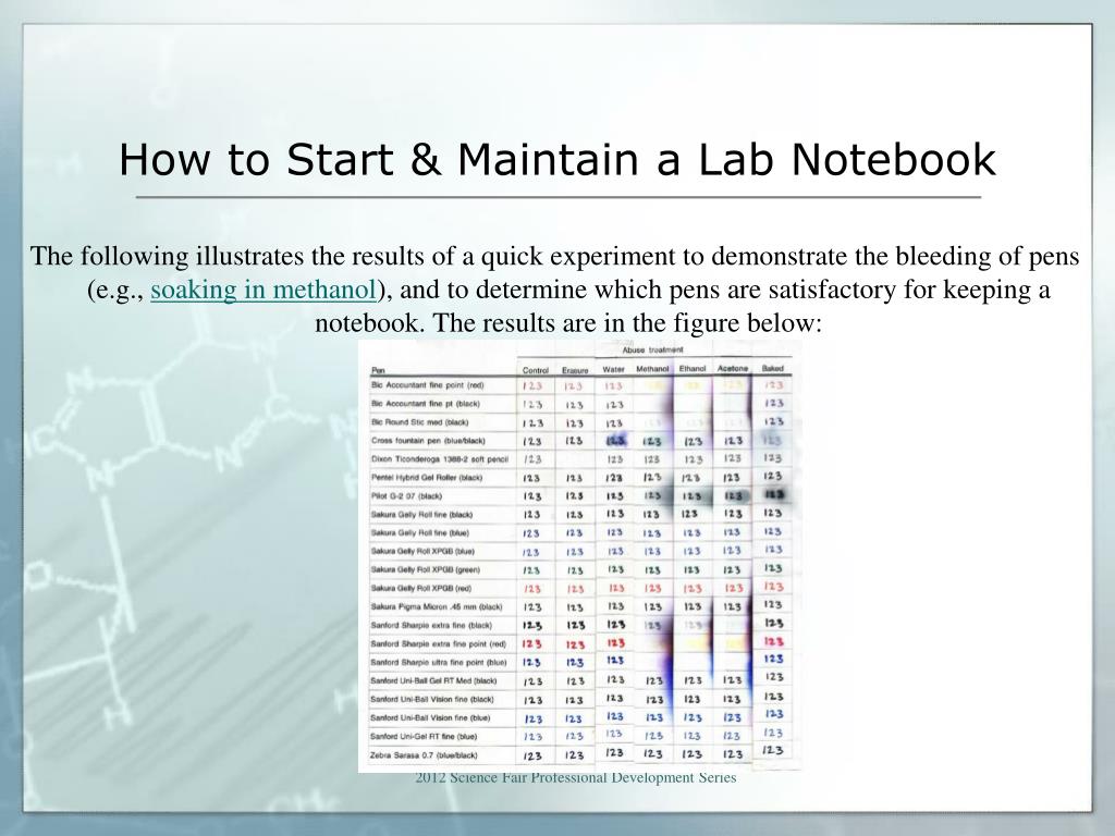 How to Start & Maintain a Lab Notebook The following illustrates the results of a quick experiment to demonstrate the bleeding of pens (e.g., soaking in methanol), and to determine which pens are satisfactory for keeping a notebook. The results are in the figure below: 2012 Science Fair Professional Development Series